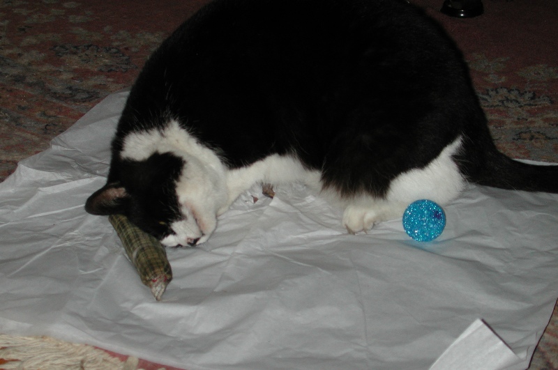 We discovered years ago that cats loved tissue paper. If you don’t believe us, wait till the holidays where tissue paper and presents are abundant, put some tissue paper or even wrapping paper down on the floor and watch what your cats will do. We ended up having a couple pieces of tissue paper in the same spot all the time in the living room. To make it more fun, I put one of our catnip sausages on the tissue paper and maybe a sparkle ball. Pretty soon our cats discovered these fun toys and started play. Every morning Lucy would wander over to the tissue paper and the catnip. In fact no one would be able to use these toys until Lucy was done. She was very protective of her cat toys. They would have to wait. Some days the tissue paper would be in many pieces and all over the room. No one would confess but someone was having fun while we were away.